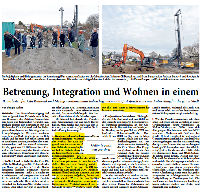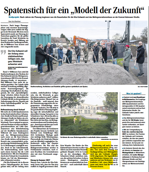 Aber die Entwicklung des Areals kann mehr: „Wir beginnen heute ein Zukunftsprojekt, das gleichzeitig eine Botschaft in sich trägt, wie wir uns in Weinheim die Stadt der Zukunft vorstellen“, beschrieb Oberbürgermeister Manuel Just beim ersten Spatenstich. Denn in einem Gebäudeensemble wird auch ein Mehrgenerationenhaus neu entstehen, mittelfristig sind auf dem Areal sozial ausgerichtete Wohngebäude vorgesehen. Miteinander auf Augenhöhe, integrierend, wertschätzend und einander befruchtend, generationsübergreifend und neugierig aufeinander, so stelle man sich die Stadtgesellschaft künftig an diesem Ort vor, so der OB. So sei die „Kita Kuhweid“, die in diesem neuen Zukunfts-Quartier als erstes gebaut wird, gleichsam nur ein Anfang eines sozialen städtebaulichen Gefüges sein, „das die Weststadt, ja ganz Weinheim aufwerten wird“.